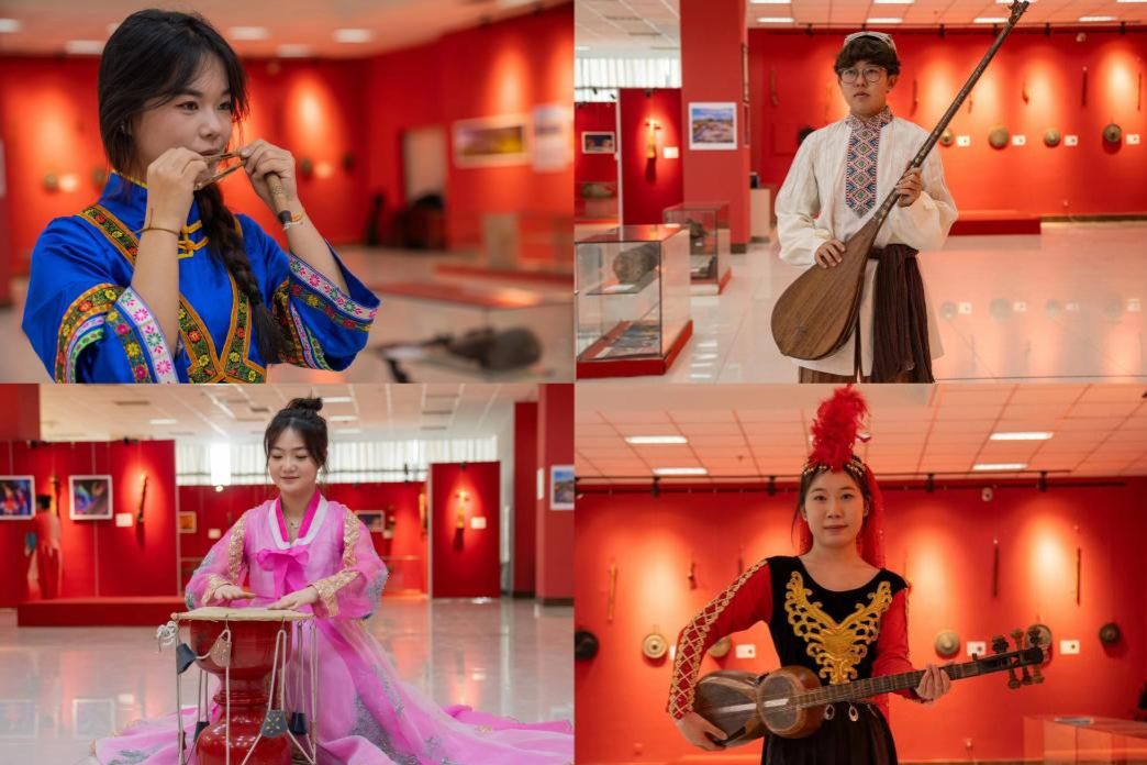 為傳承弘揚中華傳統優秀文化,助力打造“北疆文化”品牌,校慶活動期間,由音樂學院主辦、優秀校友哈斯巴更到校承辦的“北疆記憶”藝術展面向師生開展,藝術展展出哈斯巴更非遺樂器藏品和個人攝影作品。藝術展期間,我校音樂學院學生現場進行了各類樂器表演。