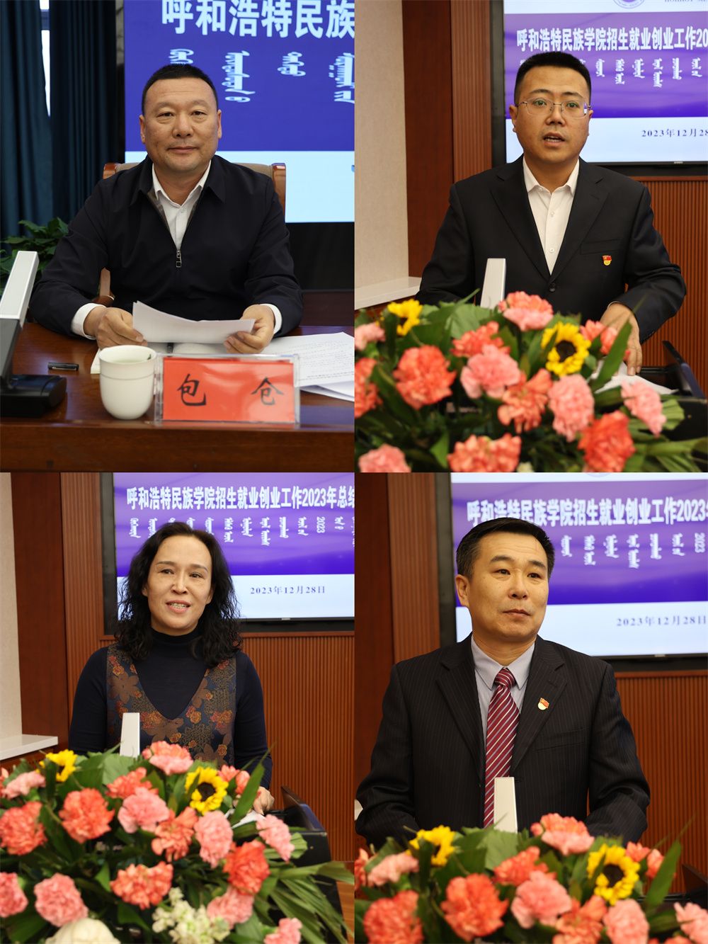 招生就業處處長包倉通報了2023屆畢業生畢業去向落實率和各學院畢業生去向落實情況。蒙古學學院、學前教育學院、民族學院分別作了就業工作交流發言。