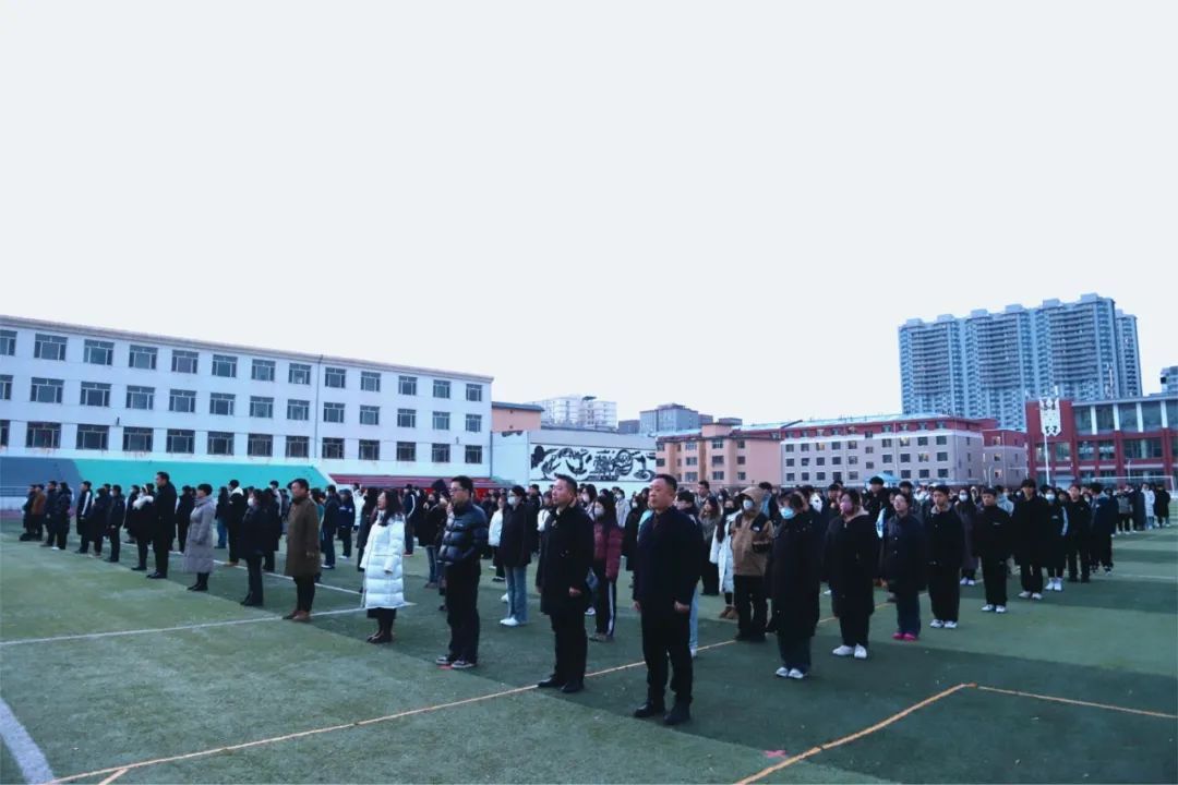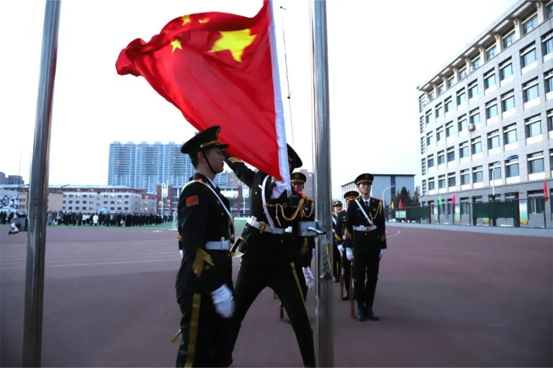 鮮艷的五星紅旗伴隨著雄壯的國歌冉冉升起,全體師生莊嚴肅立,共唱國歌,向國旗行注目禮。
