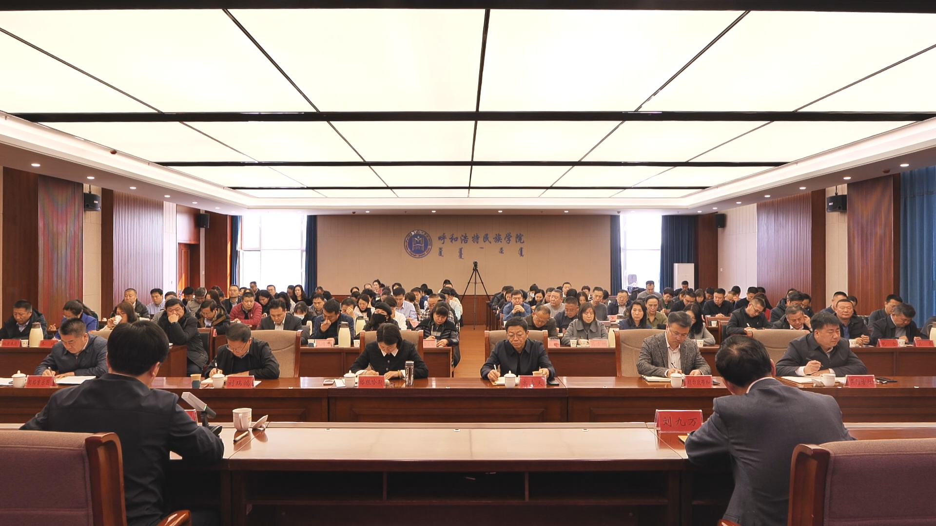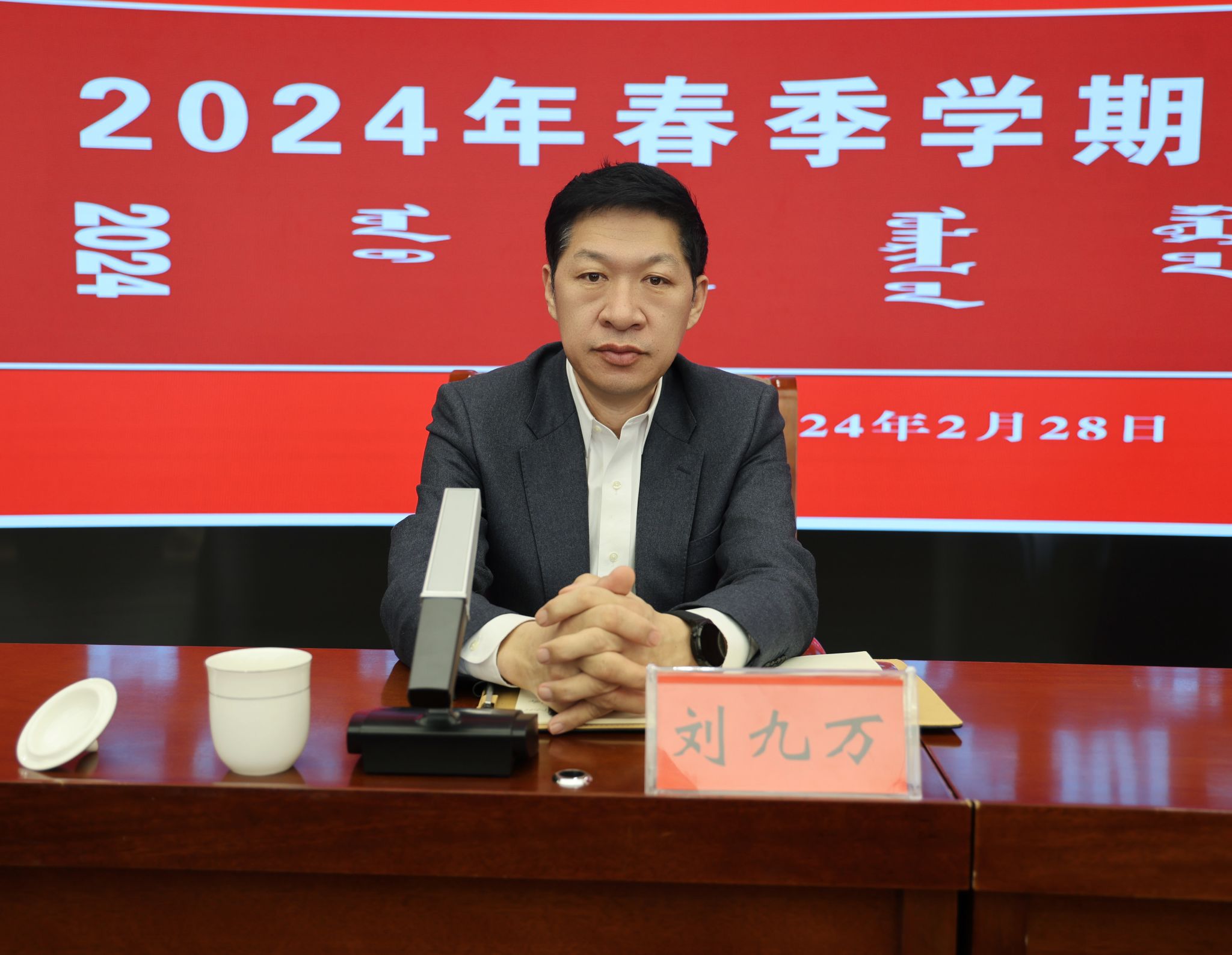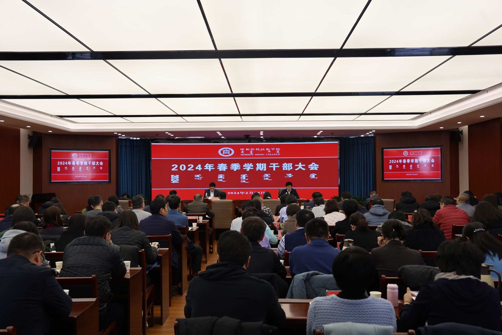 2月28日下午,學校在綜合樓12樓會議室召開2024年春季學期干部大會。校黨委書記劉九萬主持會議并作總結講話。黨委副書記、校長韓偉新回顧總結2023年工作,安排部署2024年重點工作。黨委副書記格根哈斯,黨委委員、副校長高喜天,黨委委員、副校長劉瑞鴻,黨委委員、副校長額爾敦布和等校領導出席會議,全校副處級以上干部參會。