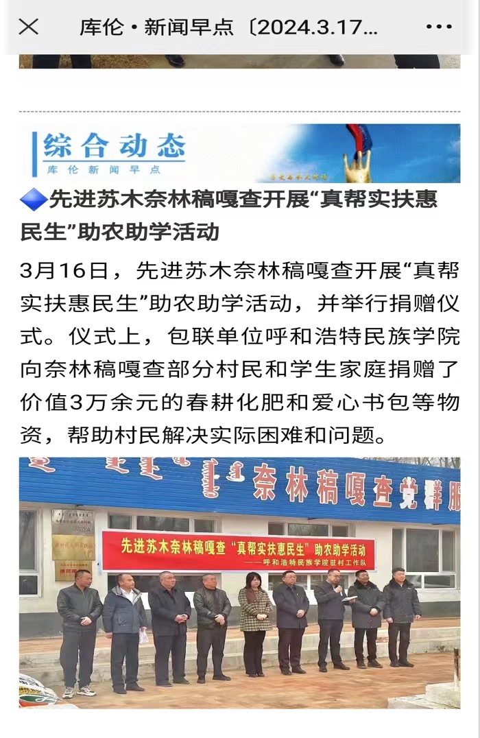 此次活動,充分體現了學校對奈林稿嘎查村民的真心實意的幫助和支持,讓村民深刻體會到包聯單位對奈林稿嘎查的關心、愛心,增強了村民自強不息,以腳踏實地的拼勁、韌勁、干勁實現夢想的信心。