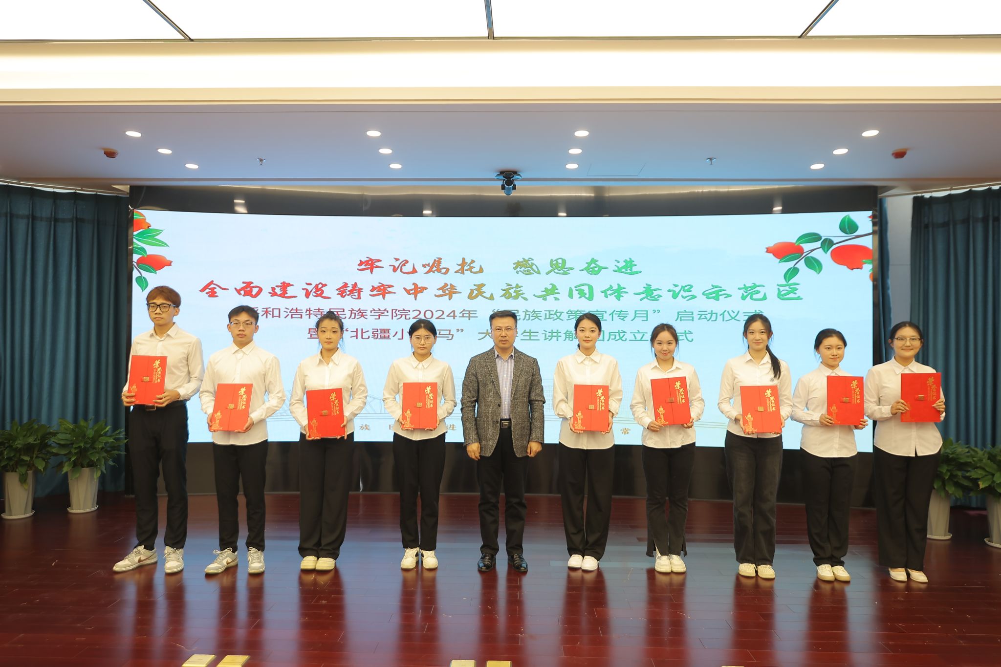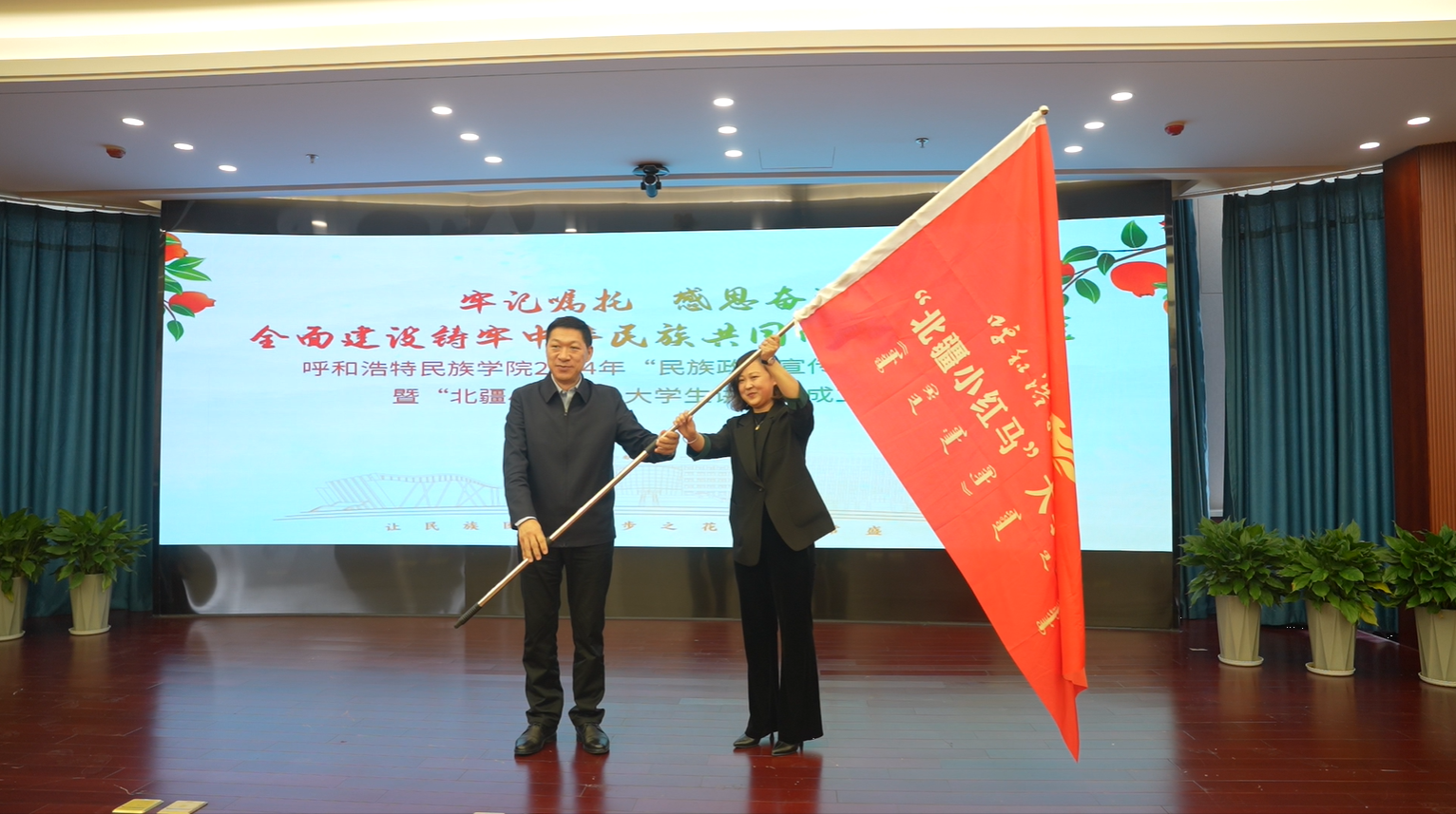儀式上,劉九萬向“北疆小紅馬”大學生講解團指導教師劉麗穎授旗,格根哈斯作了致辭,額爾敦布和向優秀講解員頒發證書,包君解讀了《民族政策宣傳月活動方案》。