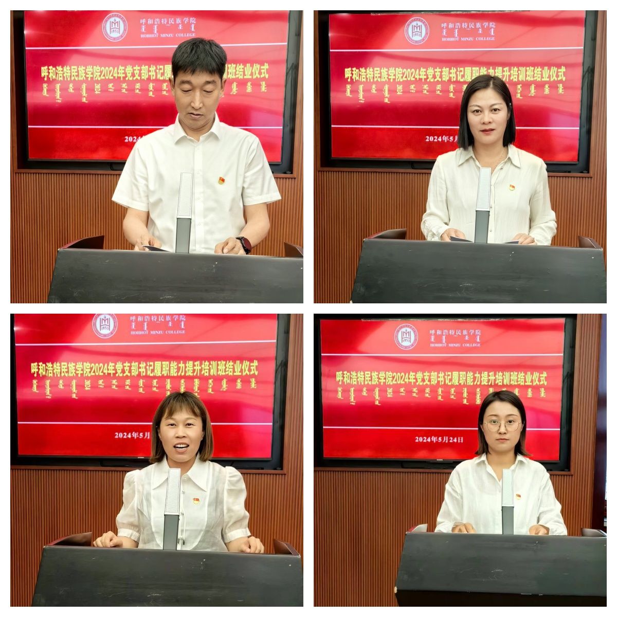 5月24日,我校2024年黨支部書記能力提升培訓班結業儀式在綜合樓十二樓會議室舉行。校黨委副書記格根哈斯出席儀式并作總結講話,黨群部門負責人、各二級黨組織書記,各基層黨支部書記共110余人參加。校黨委委員、組織部部長吳阿古拉主持會議。