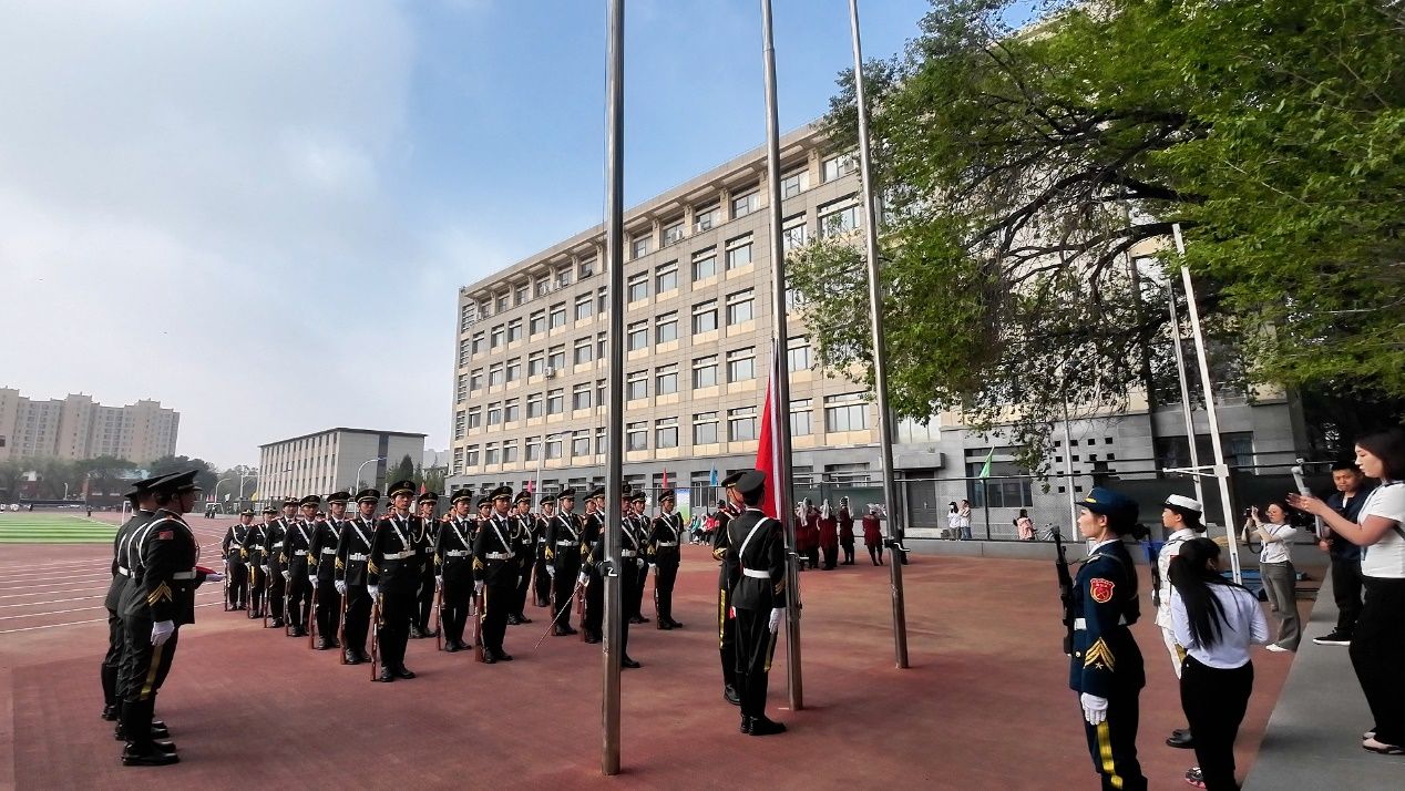 升國旗儀式上,全體師生起立,注視著五星紅旗冉冉升起,齊唱國歌。
