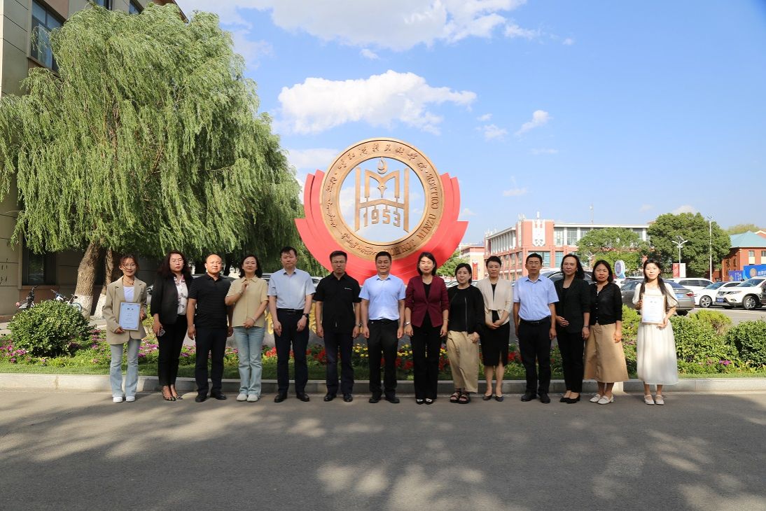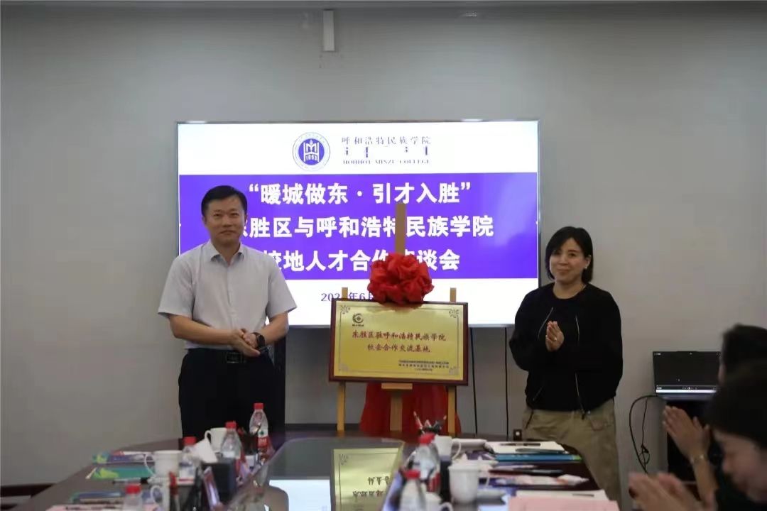 東勝區委常委、統戰部部長邊杰與學校教務處處長肖查娜為“東勝區駐呼和浩特民族學院校企合作交流基地”揭牌。