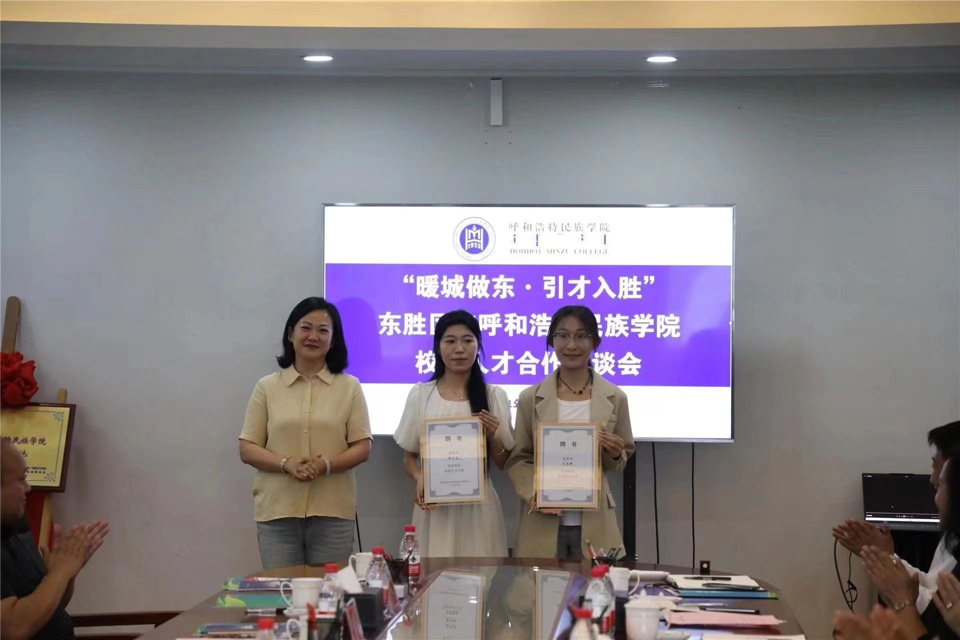 東勝區政協副主席王秀為兩位“校園引才大使”頒發聘書。